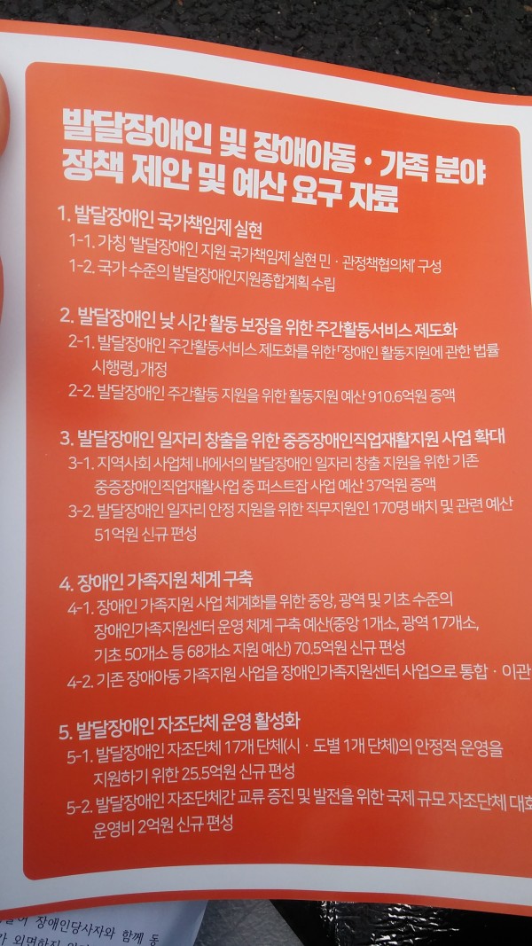 <사진 6> 발달장애인 및 장애아동 가족 분야 정책 제안 및 예산 요구 자료(위의 텍스트와 동일)