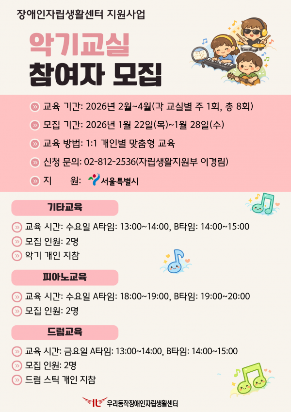 우리동작장애인자립생활센터에서는 장애인의 개별 욕구에 맞는 맞춤형 음악교육 제공을 통해 음악적 경험과 역량을 강화하기 위하여 악기교실을 운영하고 있습니다. 아래를 참고하시어 많은 신청 바랍니다.