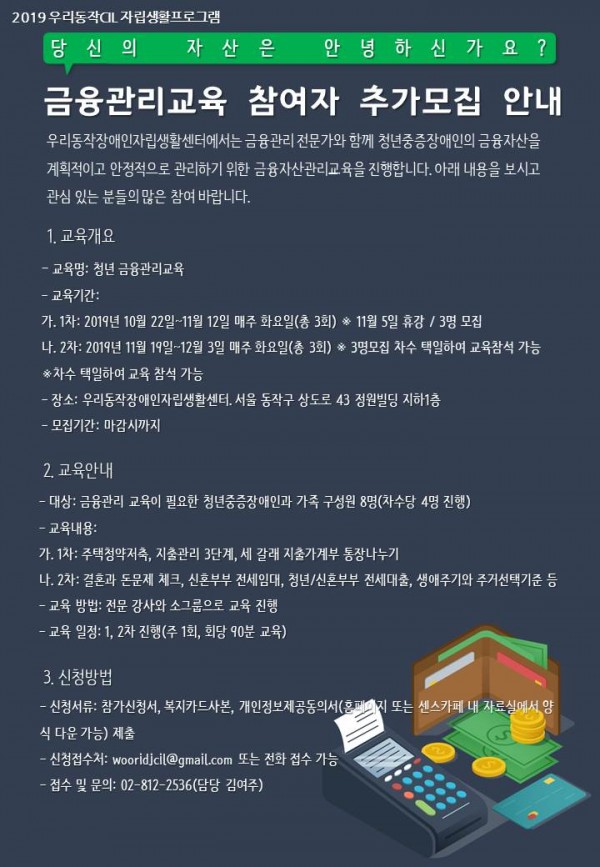 우리동작장애인자립생활센터에서는 금융관리 전문가와 함께 청년중증장애인의 금융자산을 계획적이고 안정적으로 관리하기 위한 금융자산 관리교육을 진행합니다.