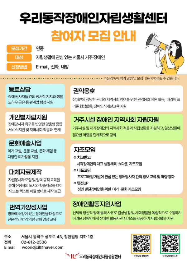모집 | 우리동작장애인자립생활센터 참여자 모집 안내