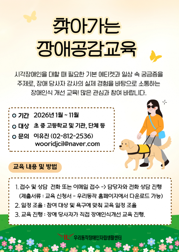 장애 당사자와 직접 소통하며 진행하는 우리동작장애인자립생활센터 장애공감교육에 많은 관심과 참여 부탁드립니다.