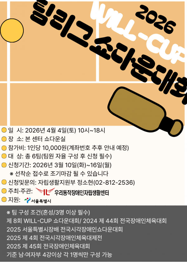 이와 관련하여 『2026년 WILL-CUP 팀리그 쇼다운대회』를 진행하고자 하오니 많은 참여 부탁드립니다.
